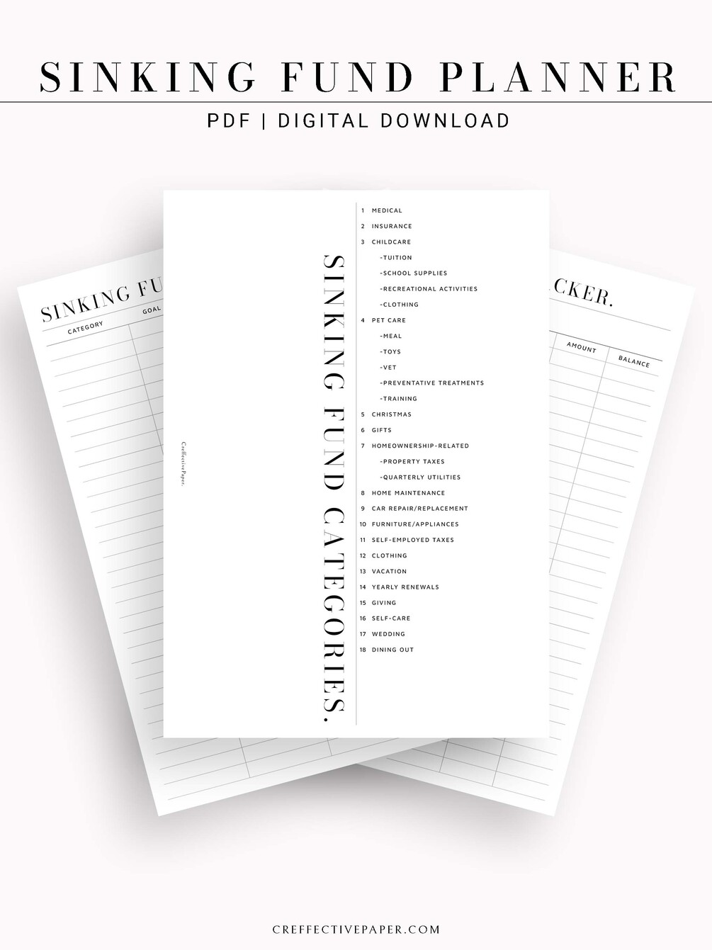 ● The sinking fund is a simple and functional method of setting money each month for a specific purpose, separate from your emergency and general savings. Since you decide in advance what to save for and the amount to set aside, you can spend without worrying or regret when it comes time to make your purchase. These inserts include sinking fund categories, lists, and trackers.