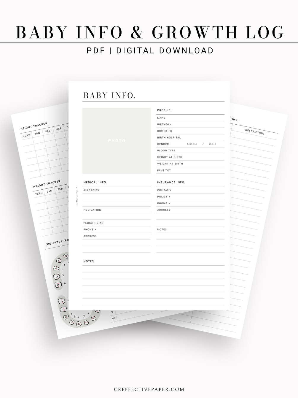 ● If you’re a new mom, there is no better choice than these printables. Keep track and commemorate each area of your baby with these printable baby information & growth log. These Printables include Basic Profile, Medical Info, Insurance Info, Height and Weight Tracker, Records for Appearance of teeth, Vaccination, and Records of the first moments of a Baby.