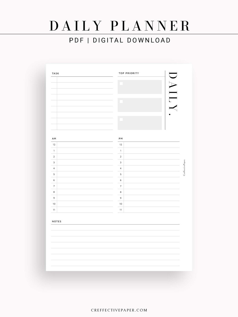 ● 24 Hourly Schedule Daily Planner, Day on a Page, Daily Task, Top Priority